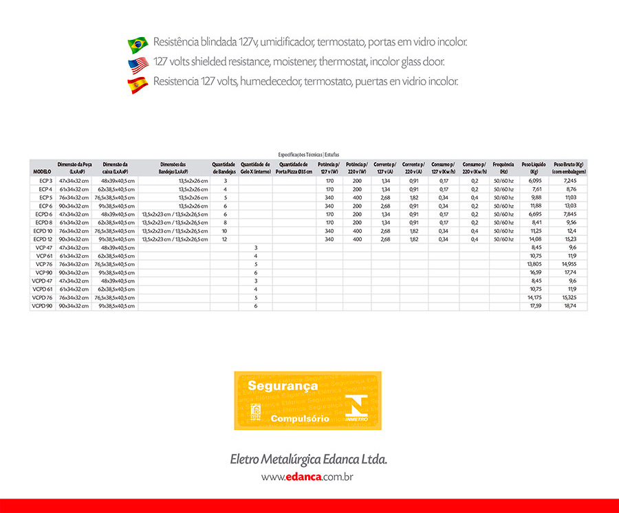 - Resistência blindada 127v, umidificador, termostato, portas em vidro incolor;